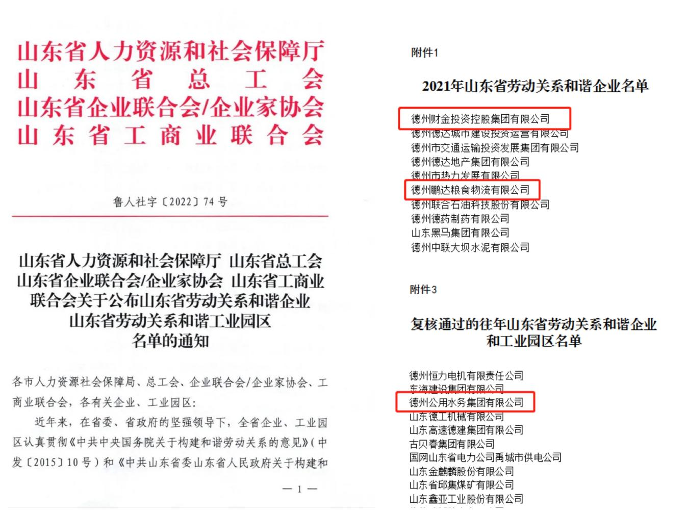 喜报│财金集团及2家权属公司荣获“山东省劳动关系和谐企业”荣誉称号