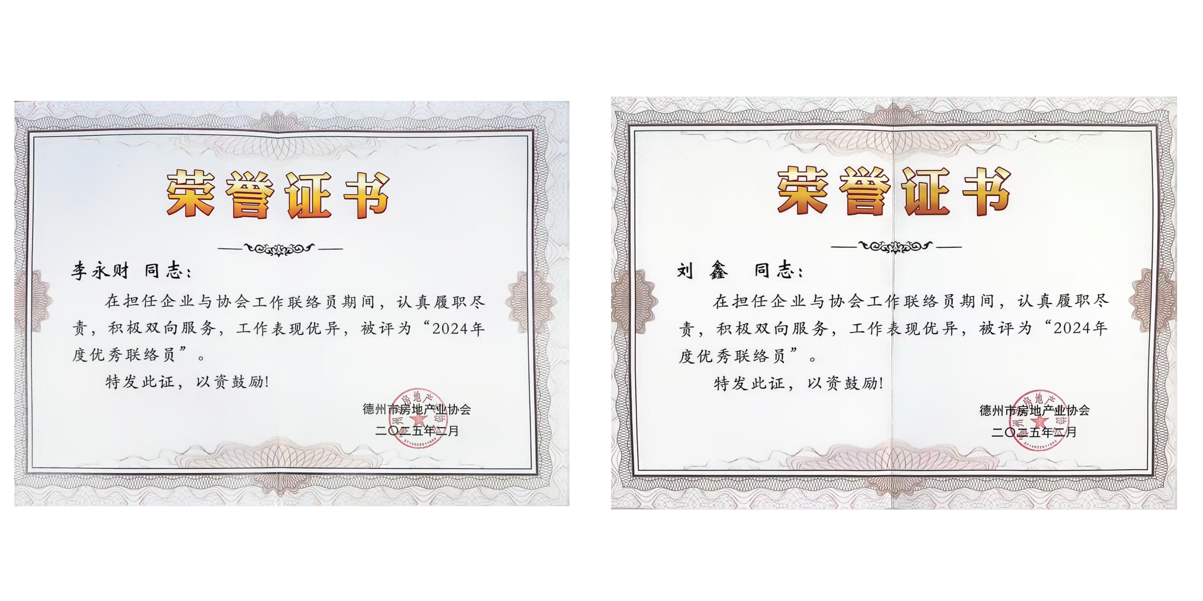 2月26日,德州市房地产业协会召开第三届第四次理事会扩大会议,德州财金综合开发集团有限公司被授予2024年度“德州市房地产业协会优秀会员单位”及“百城千企商品房促销”“方便看房”两项活动突出表现单位荣誉称号,子公司—宁津嘉宁置业有限公司被授予2024年度“德州市房地产业协会优秀会员单位”荣誉称号,刘鑫、李永财同志被授予2024年度“优秀联络员”称号。