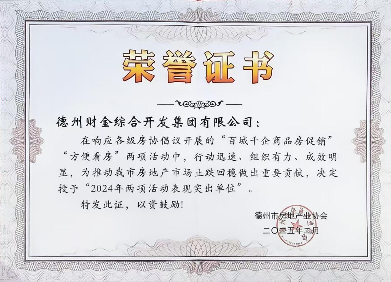 喜报│财金开发集团获评2024年度“德州市房协优秀会员单位”及“百城千企商品房促销”“方便看房”两项活动突出表现单位