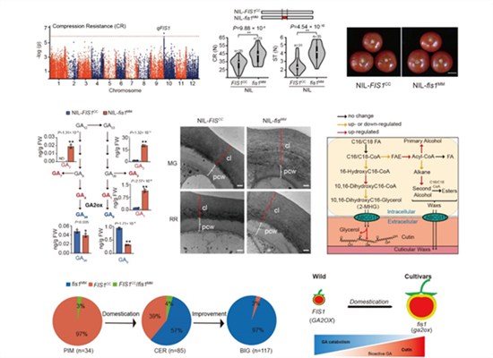 研究者利用番茄的重组自交系群体,通过关联分析获得了一个调控番茄果实硬度的主效QTL位点qFIS1。图位克隆发现该位点是由于一个编码赤霉素2-氧化酶的基因FIS1的突变造成的。栽培番茄中FIS1的突变,导致果皮中活性赤霉素含量升高,果皮角质层发生变化,角质和蜡质合成增多,因此果实硬度增加、货架期延长。除此之外,FIS1对果实硬度的改变,并不影响果实发育和风味等重要性状。对该位点进行基因编辑改良,可以显著增加番茄果实的硬度。因此该研究不仅首次证明了赤霉素参与调控番茄果实成熟过程中的果实硬度形成,而且为果实硬度的育种选择和定向改良提供了理想靶点。